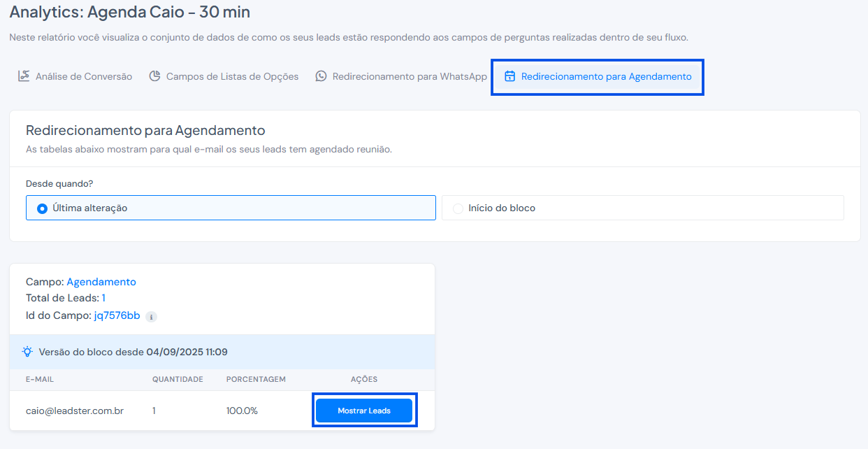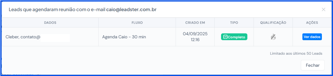 - E clicando em “Mostrar Leads” você consegue visualizar ver detalhes dos contatos que realizaram o agendamento: