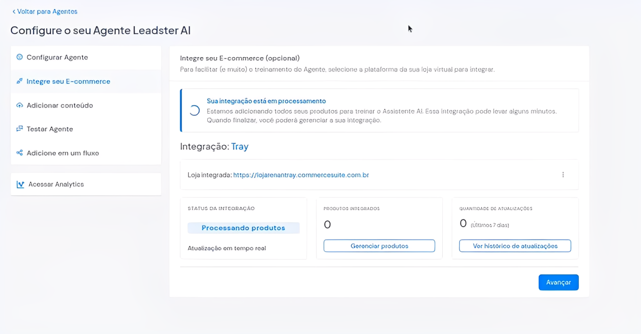 - Depois de integrado, experimente fazer perguntas simulando um visitante para garantir que o Shopbot responde corretamente com base no seu catálogo na aba Testar Agente. Se algo não estiver funcionando como esperado, revise as configurações ou entre em contato com o time de suporte da Leadster.