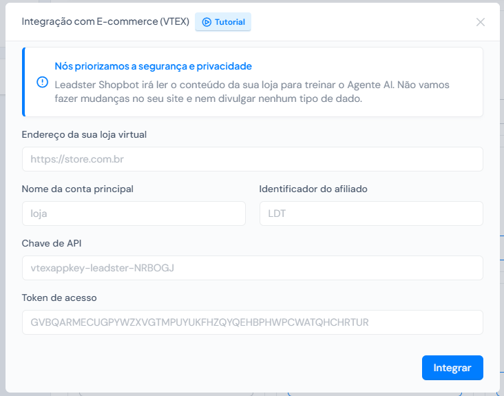 - Um pop-up será aberto solicitando informações de integração.
