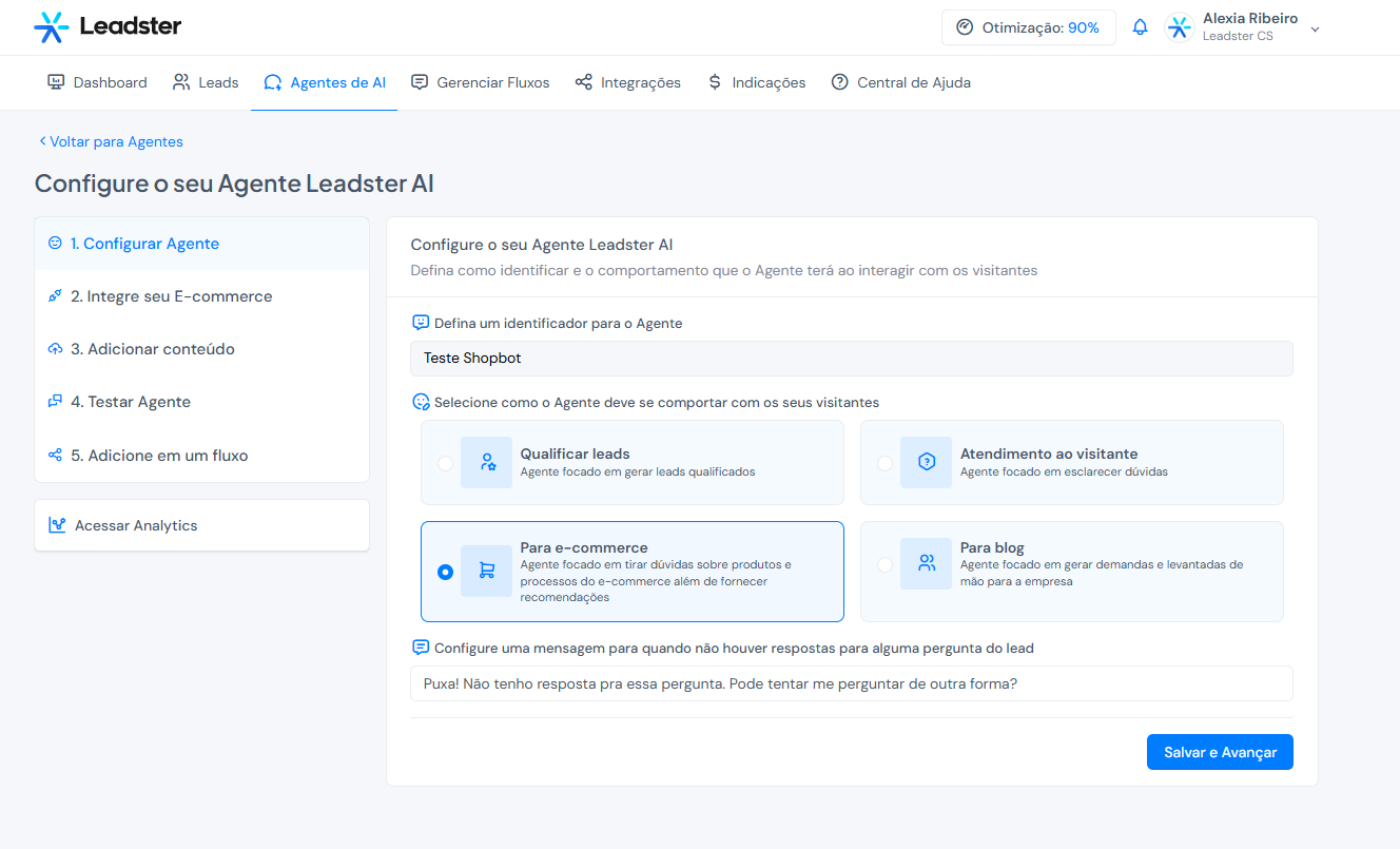 - Depois de integrado, experimente fazer perguntas simulando um visitante para garantir que o Shopbot responde corretamente com base no seu catálogo na aba Testar Agente. Se algo não estiver funcionando como esperado, revise as configurações ou entre em contato com o time de suporte da Leadster.
