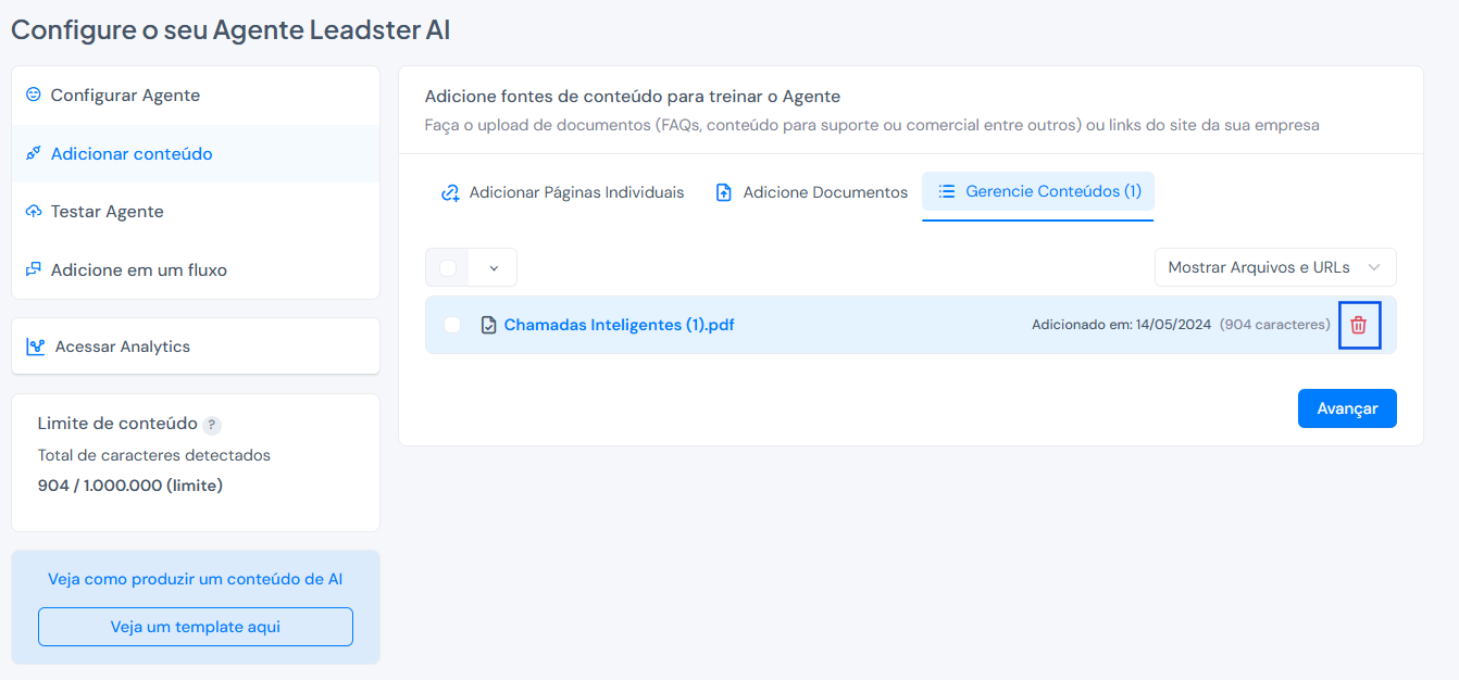 Na plataforma da Leadster, com o Agente IA criado (como orienta no tutorial Como configurar a IA para Shopbot), na etapa 3 você escolhe quais conteúdos o Agente AI utilizará como base para responder os visitantes.