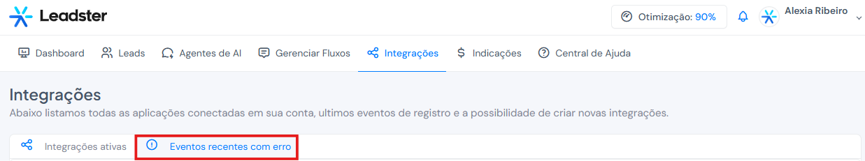 - Na aba Integração, selecione a opção “Eventos recentes com erro”.