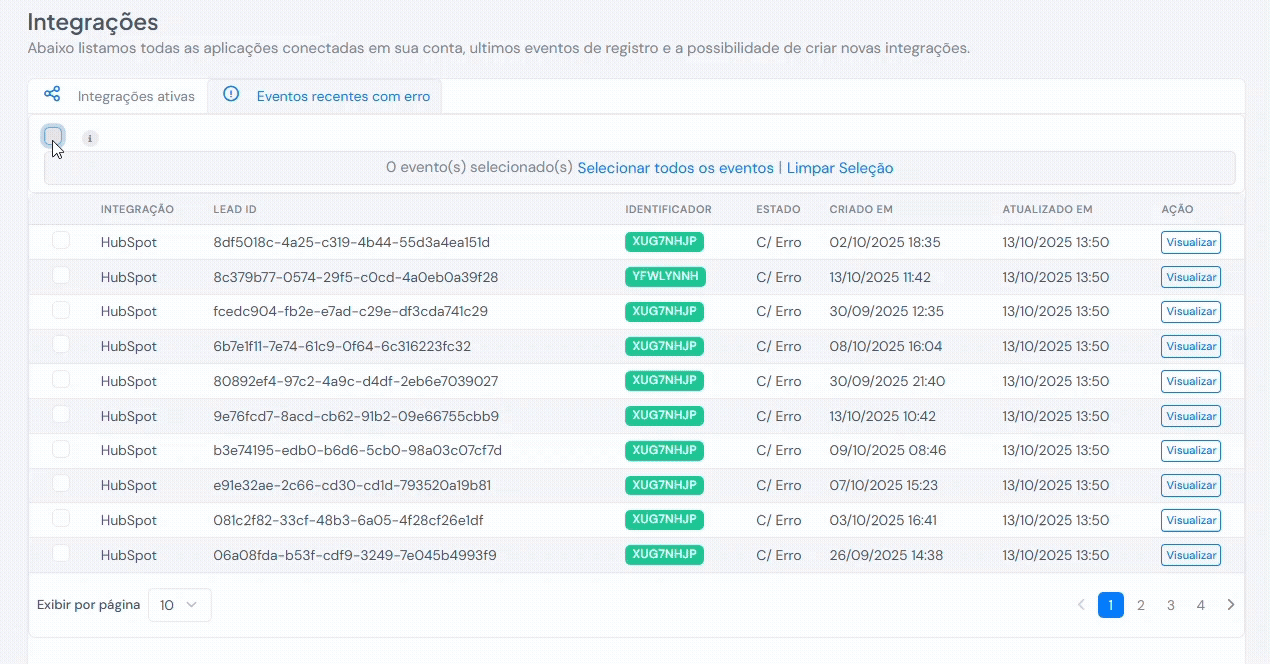 Agora é possível reenviar leads que tiveram erro de integração diretamente pela plataforma. Essa funcionalidade permite tentar resolver os erros em massa ou individualmente.