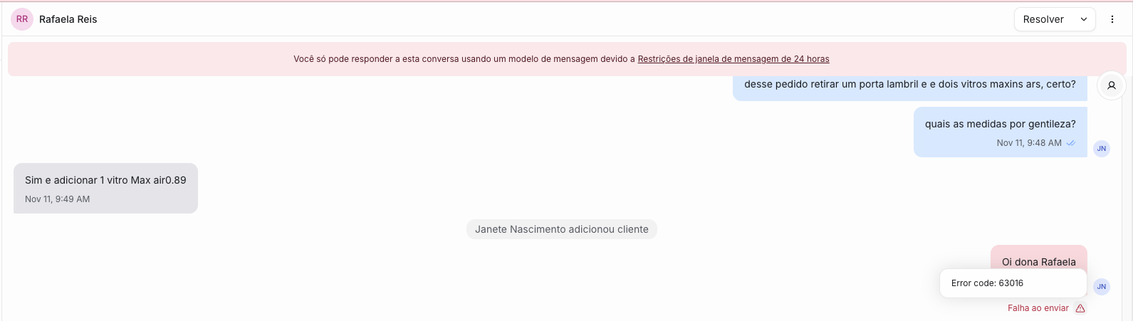 Motivo (WhatsApp): você tentou enviar uma mensagem livre (não-template) fora da janela de 24h do WhatsApp. Nesse caso, só é permitido enviar template message (modelo aprovado).