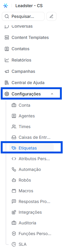 - Acesse o menu lateral e clique em Configurações → Etiquetas.