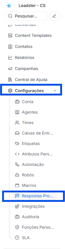 - Acesse o menu lateral e clique em Configurações → Respostas Prontas.