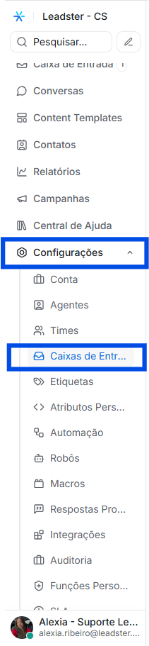 - Acesse o menu lateral e clique em Configurações → Caixa de entrada.