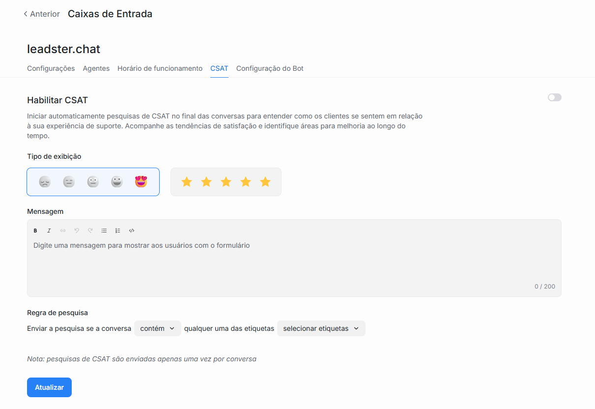 Neste tutorial, você vai aprender como ativar e configurar o CSAT na sua Caixa de Entrada 🎉