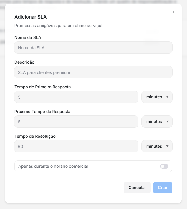- Defina o tempo de primeira resposta, o próximo tempo de resposta e o tempo de resolução, você pode configurá-los em minutos, horas ou dias, conforme a necessidade do seu atendimento.