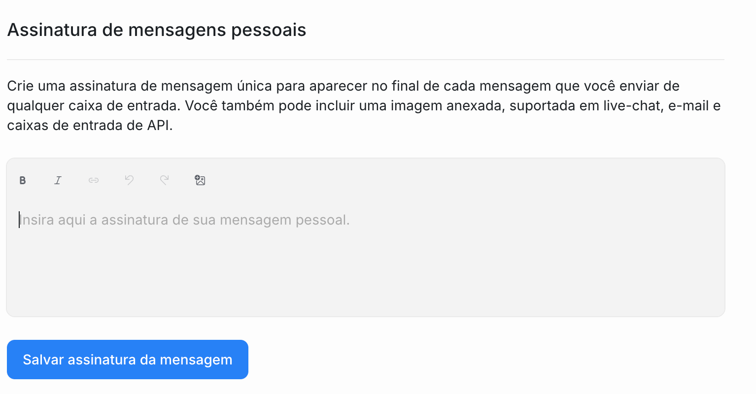 - A assinatura é aplicada em todos os canais de texto, incluindo WhatsApp, Instagram, Telegram e Live Chat.