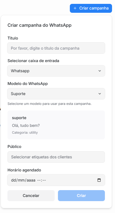 Ao criar a campanha, você poderá filtrar e selecionar os contatos por meio dessas etiquetas — por exemplo: clientes novos, interessados em produto X, carrinho abandonado ou leads qualificados.