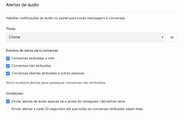 - Role para baixo até localizar a sessão "Alertas de áudio". Nesta sessão você consegue habilitar sinais sonoros para notificação e consegue definir o som, o evento que será disparado e as condições.