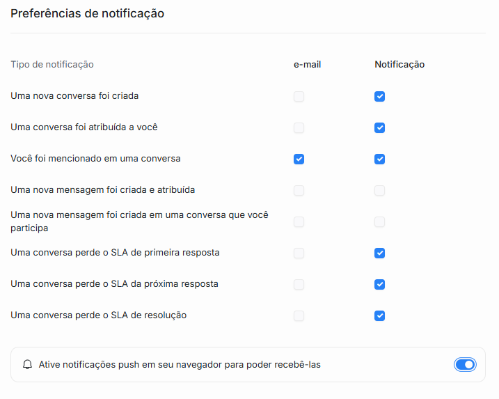 - Logo abaixo, você consegue definir as preferências de notificações. Nesta sessão você pode definir o tipo de notificação que deseja receber e por qual canal, e-mail ou notificação push.