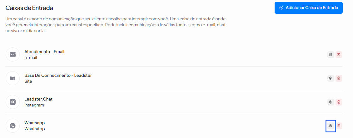 - Na plataforma do WhatsApp Suite, vá em: Configurações → Caixas de entrada.