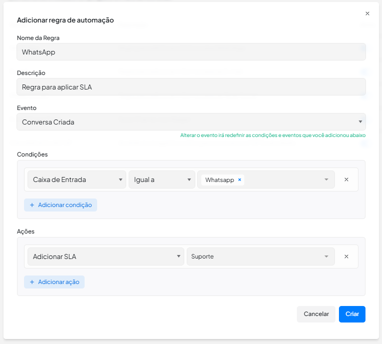 Atualmente, o SLA é aplicado por meio de uma regra de automação, vinculada à caixa de entrada desejada.
