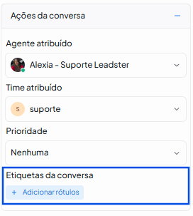 A etiqueta adicionada passará a aparecer no histórico de ações da conversa, facilitando a organização e o acompanhamento do atendimento.