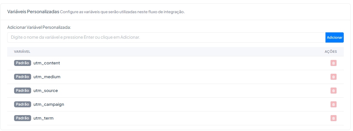 Variáveis personalizadas são campos que armazenam informações específicas do lead ou da origem dele, como parâmetros de campanha (UTMs), e que podem ser utilizadas durante o fluxo de integração. Elas ajudam a: