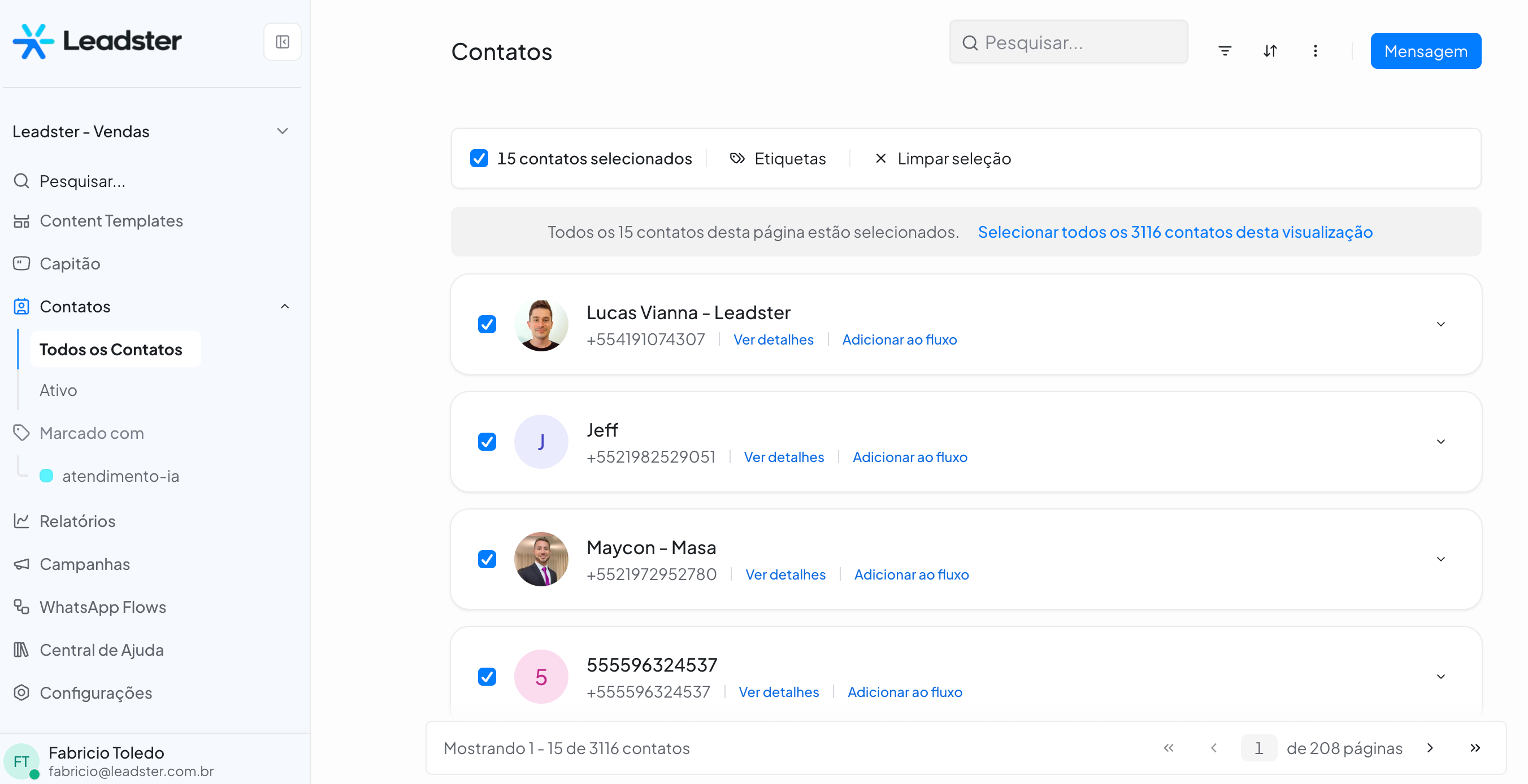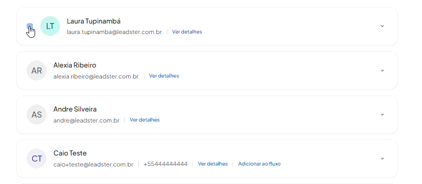 1. Na aba Contatos, selecione os contatos desejados marcando o checkbox ao lado do nome. Para selecionar todos os contatos visíveis na página, utilize o checkbox da barra superior.