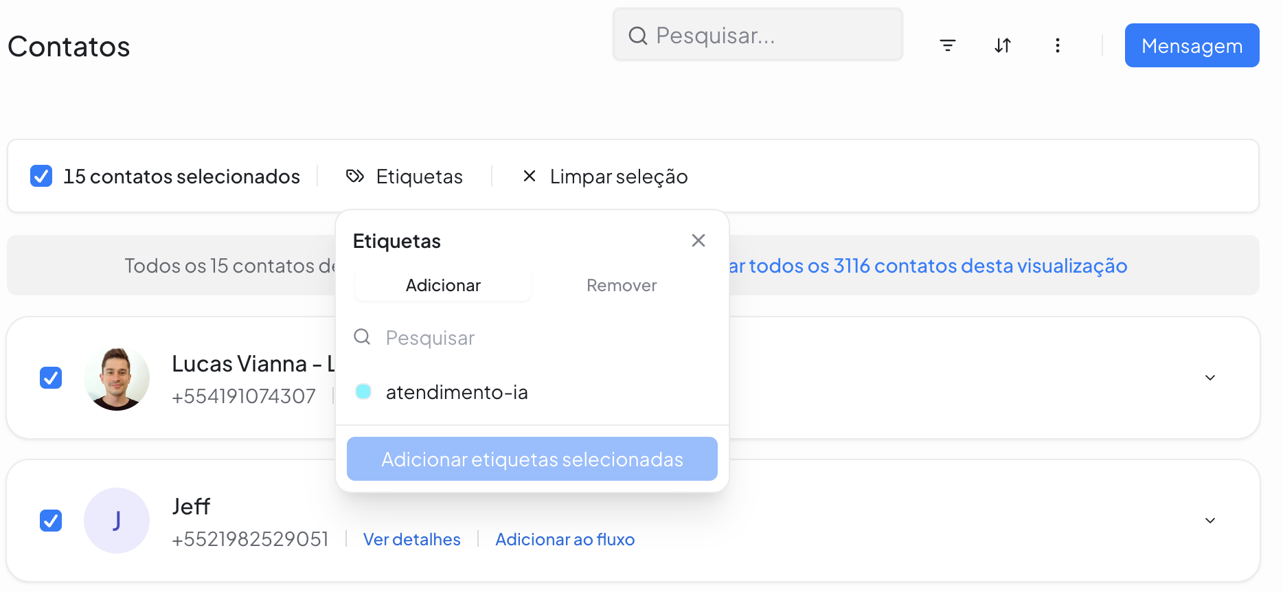 Adiciona as etiquetas escolhidas aos contatos selecionados.