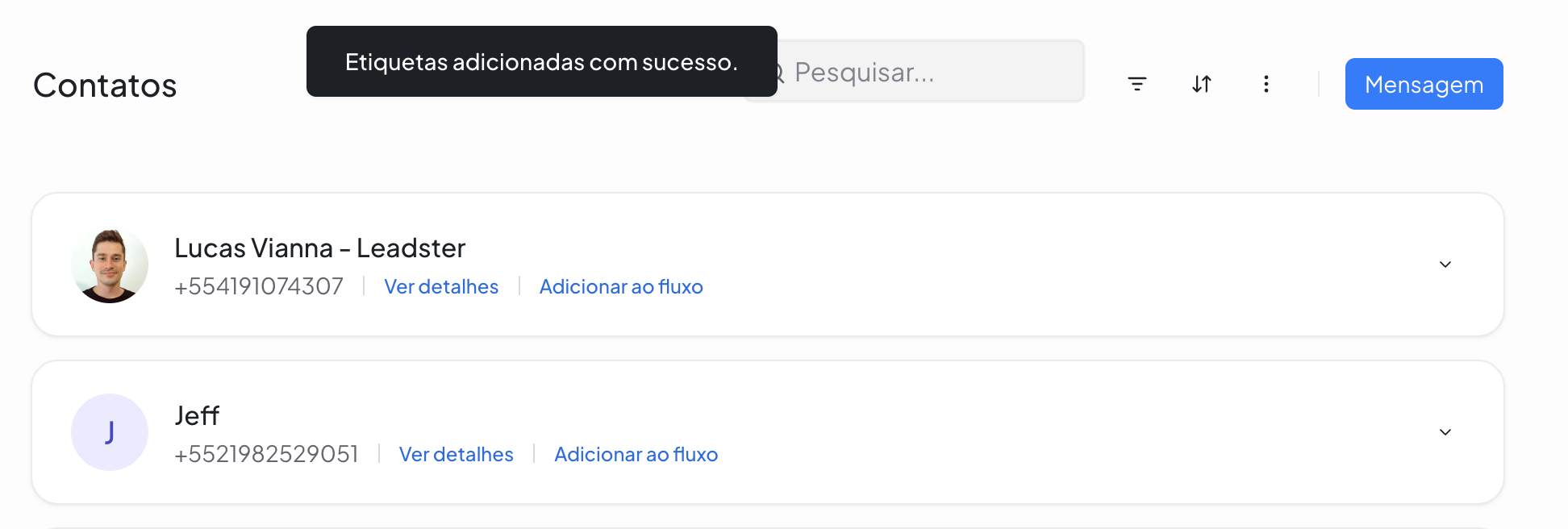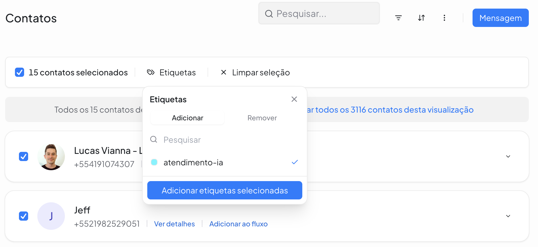 A funcionalidade de Etiquetas em Massa permite adicionar ou remover etiquetas de vários contatos ao mesmo tempo, sem a necessidade de abrir um por um.
