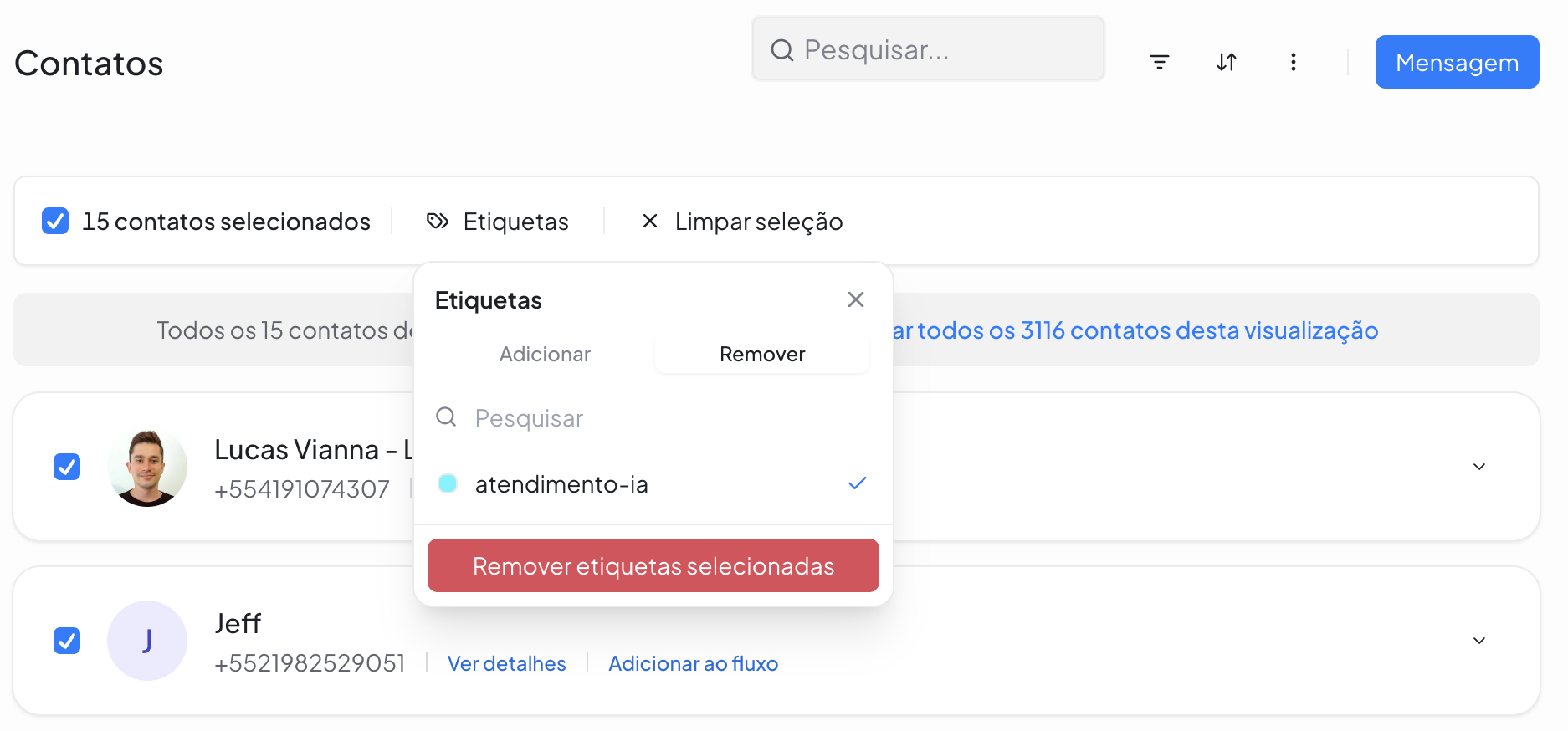 - Remover, para excluir etiquetas específicas dos contatos selecionados