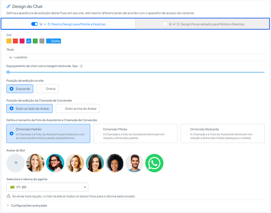 - Tamanho da foto do assistente e da chamada: Ajuste as dimensões da foto do assistente e da chamada de conversão conforme sua preferência. Entre: Padrão, Média ou Reduzida.