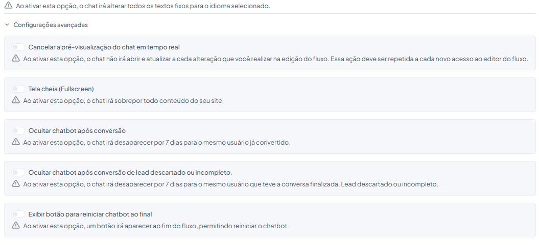 - Cancelar pré-visualização em tempo real: Ao ativar essa opção, o chat não será atualizado automaticamente a cada edição feita no assistente.