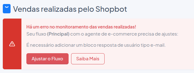 Se você está vendo uma caixa de alerta no seu dashboard, isso significa que existe um agente de IA para e-commerce (Shopbot) vinculado a um fluxo ativo em sua loja virtual, mas falta uma configuração necessária para que o monitoramento de vendas funcione corretamente.