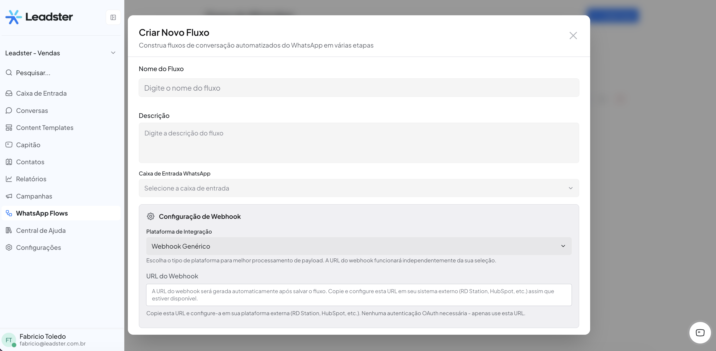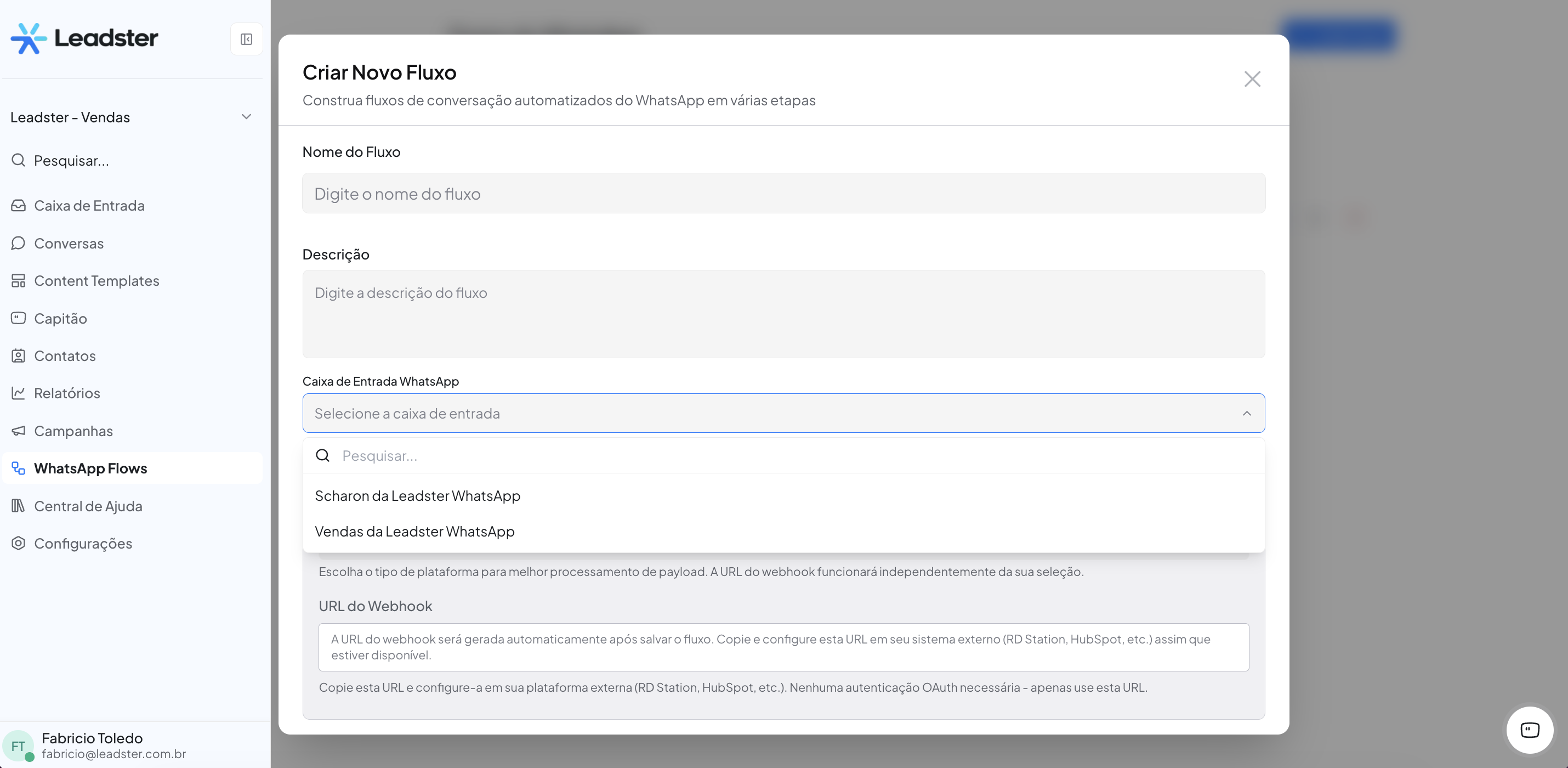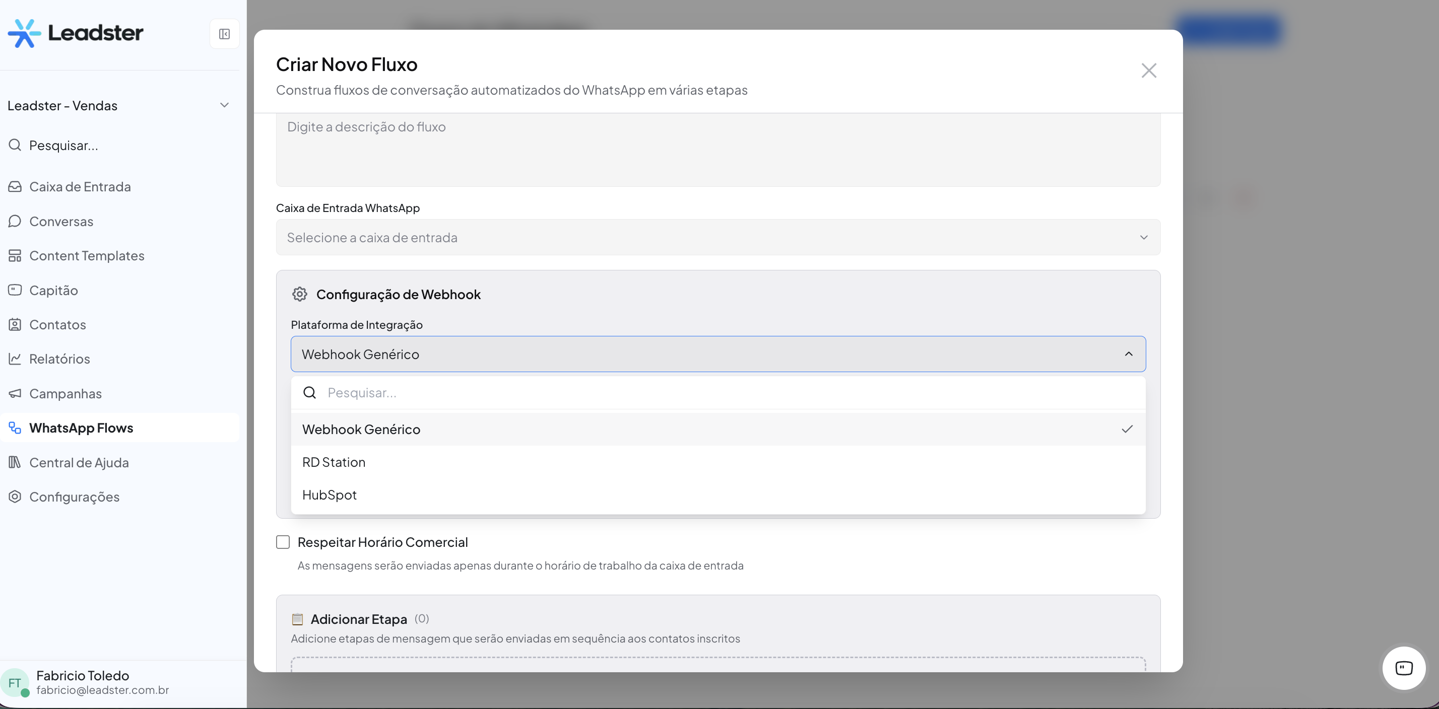 💡 Dica: As opções disponíveis refletem as caixas de entrada WhatsApp configuradas na sua conta. Escolha o número correto para o contexto do fluxo (ex: "Vendas da Leadster WhatsApp").