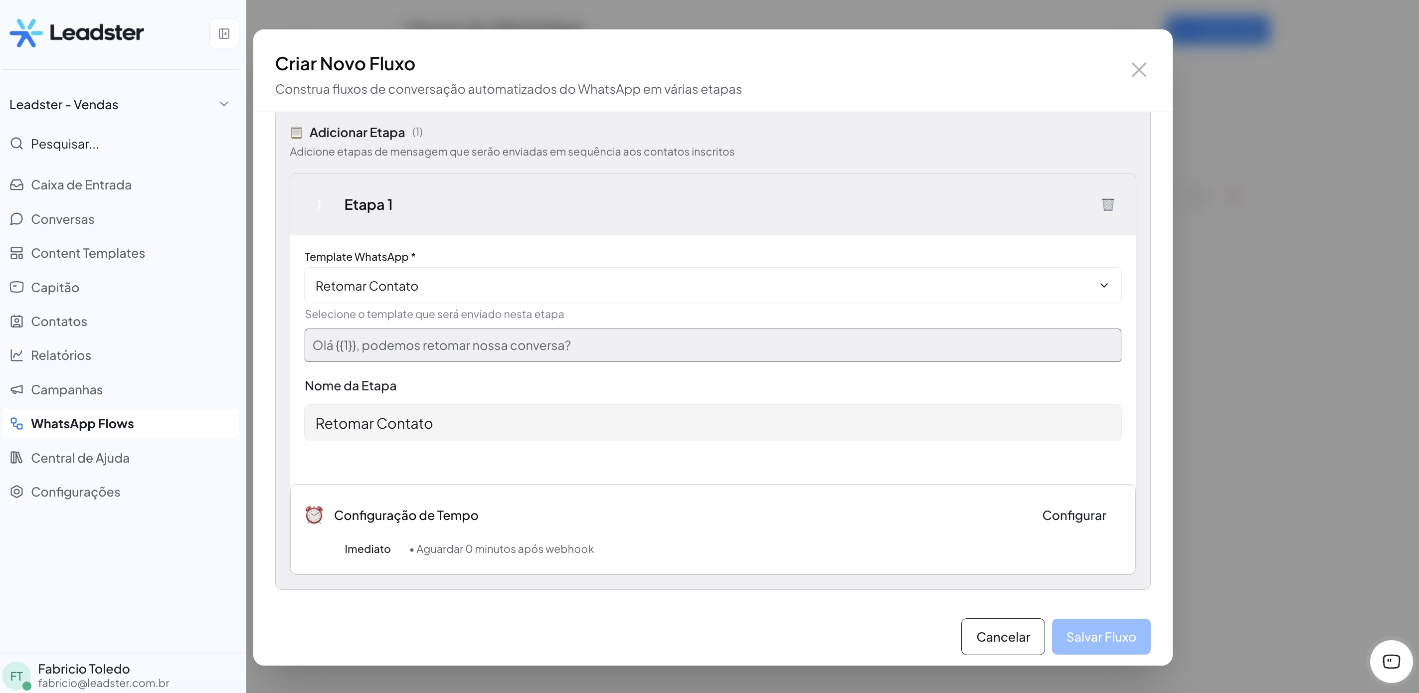 - Na seção "Adicionar Etapa", você define quais templates de WhatsApp serão enviados e em qual ordem. Um fluxo pode ter várias etapas sequenciais.