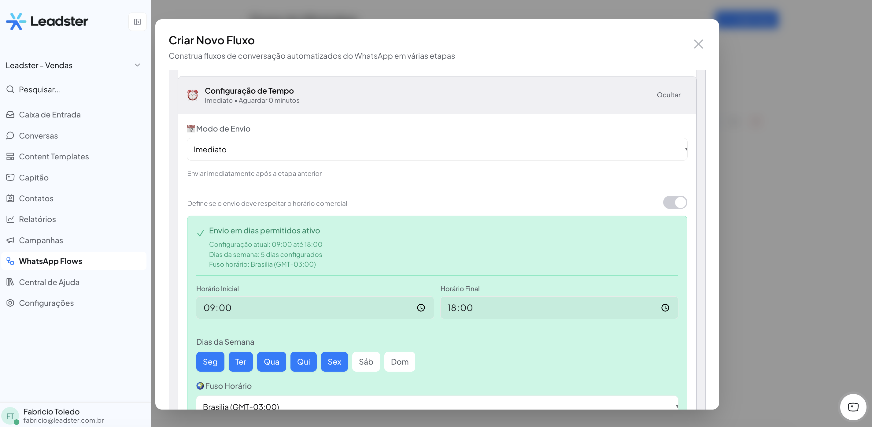 - Dias da Semana: selecione quais dias o fluxo pode enviar mensagens. Os dias ativos ficam destacados em azul.