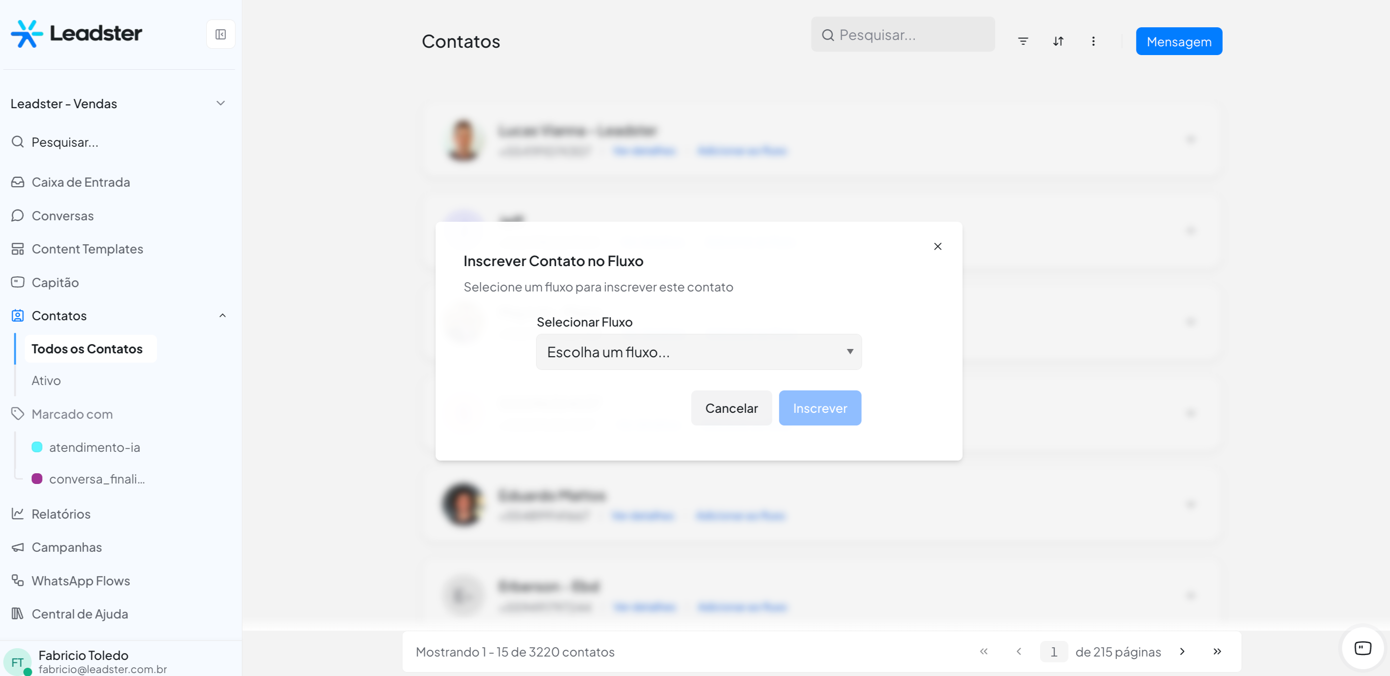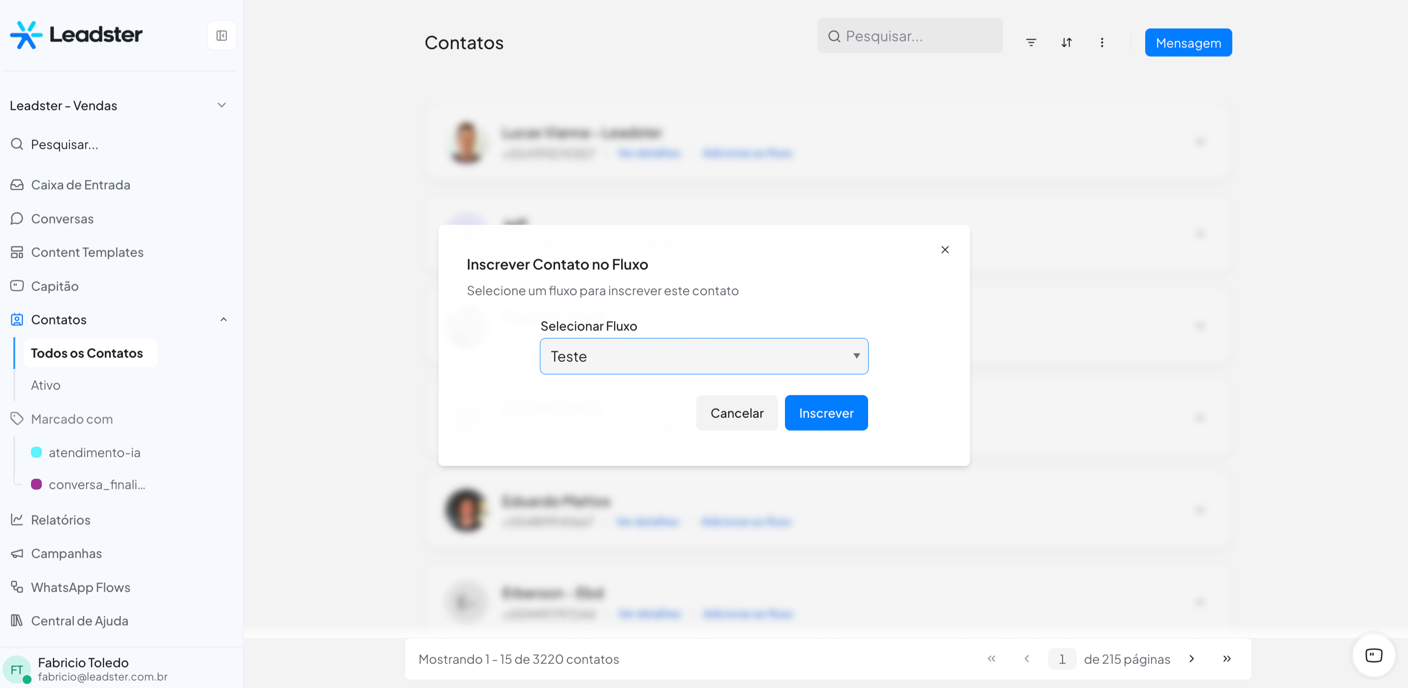 - Clique no ícone de gerenciar (ícone de colunas/ajuste) no card do fluxo para abrir a tela de "Gerenciar Contatos". Nessa tela você pode visualizar e monitorar todos os contatos inscritos no fluxo.