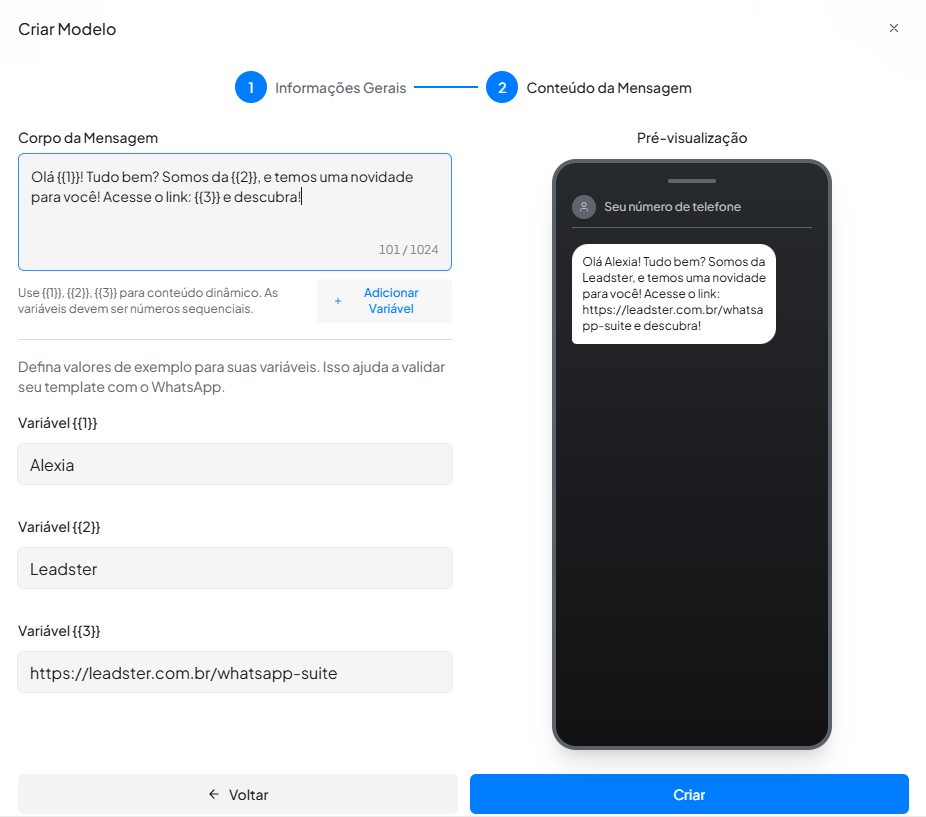 - Na variável {{3}}, se for um link, você pode inserir uma URL (ex: https://leadster.com.br/whatsapp-suite), que normalmente será utilizada como um valor estático.