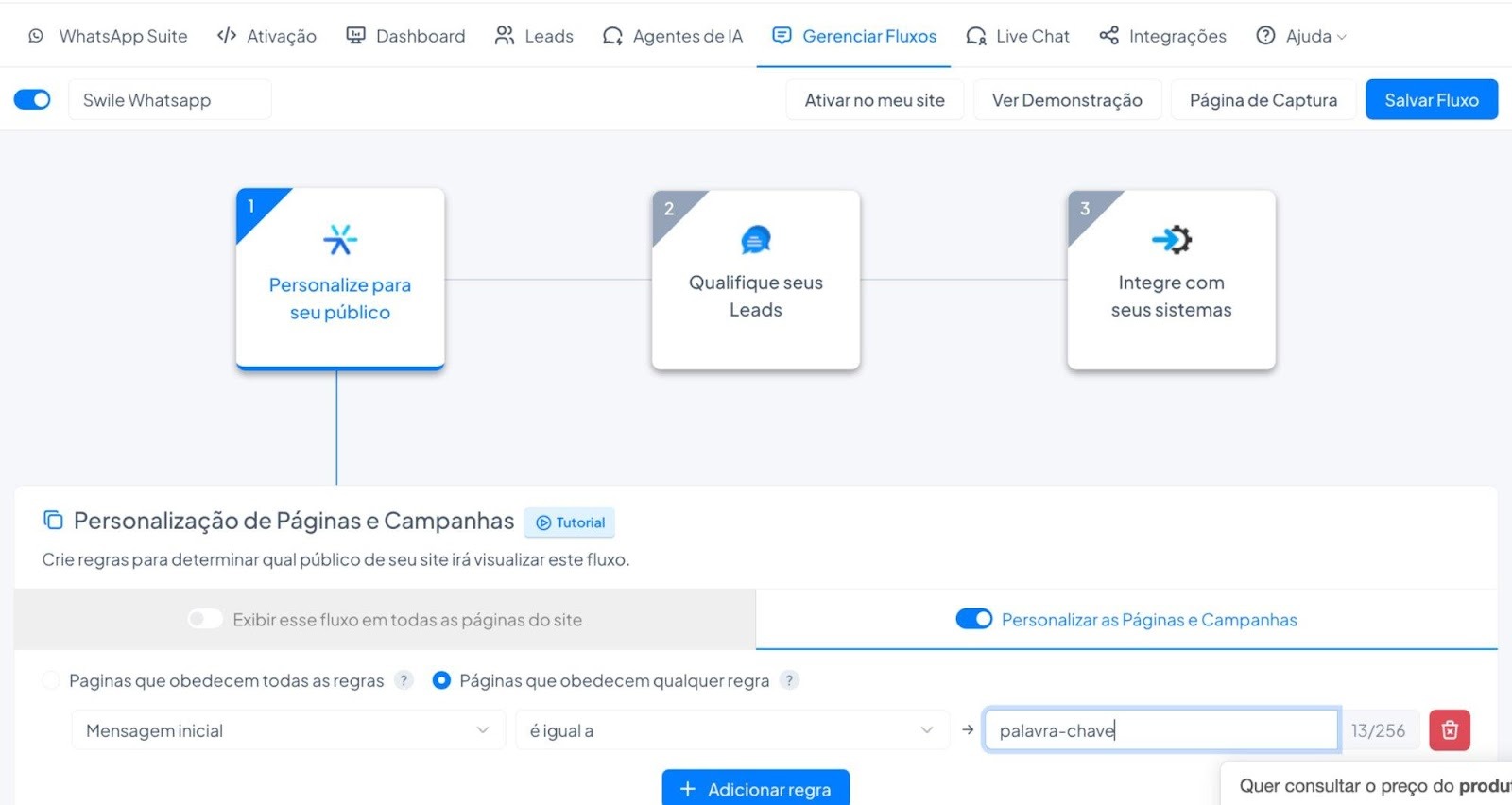| Fluxo Palavra-Chave | Contém: promo | Quando a msg contiver "promo" em qualquer posição |