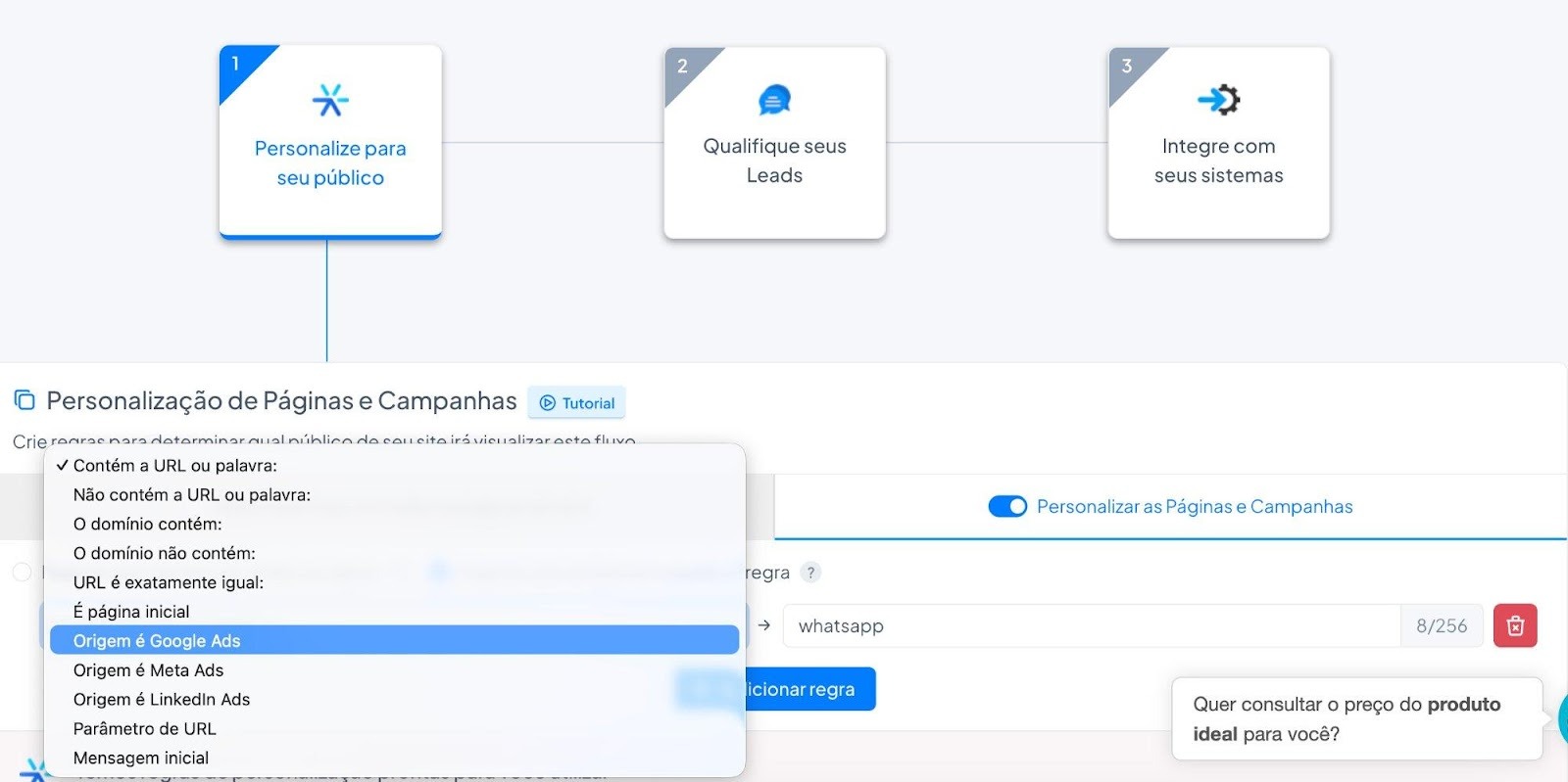 Dentro do fluxo, clique na etapa 1: Personalize para seu público. Role a tela até a seção Personalização de Páginas e Campanhas.