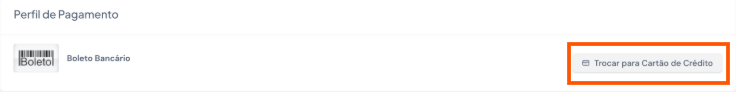 - Para alterar a forma de pagamento, acesse Perfil de pagamento e clique em Trocar. Você poderá escolher entre cartão de crédito ou boleto bancário.